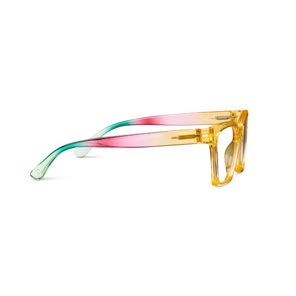 Why blend in when you could stand out? Maisie is a one-of-a-kind pair that makes a bold statement. While the classic square shape may be traditional, everything else about these frames is anything but. The bright, translucent yellow fronts feature colorful ombre temples, complemented by blue fronts with a bold ikat pattern on the side.